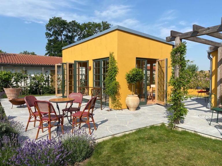 En annan företeelse från Södern är att man kan torrskodd runt huskropparna utan att behöva kliva ner på marken. Just därför sammanband vi både huskroppar och terrasser med kalksten. Grå kalksten, slät, oregelbunden i formen och fogad med finbetong för att hålla ogräset stången. En fjärilsrabatt ville man också ha. Den placerade vi med utsikt från limonaian. Och på andra långsidan en köksträdgård med odlingsbäddar av putsade lecablock som också dessa målades i samma kulör som husen och orangeriet.